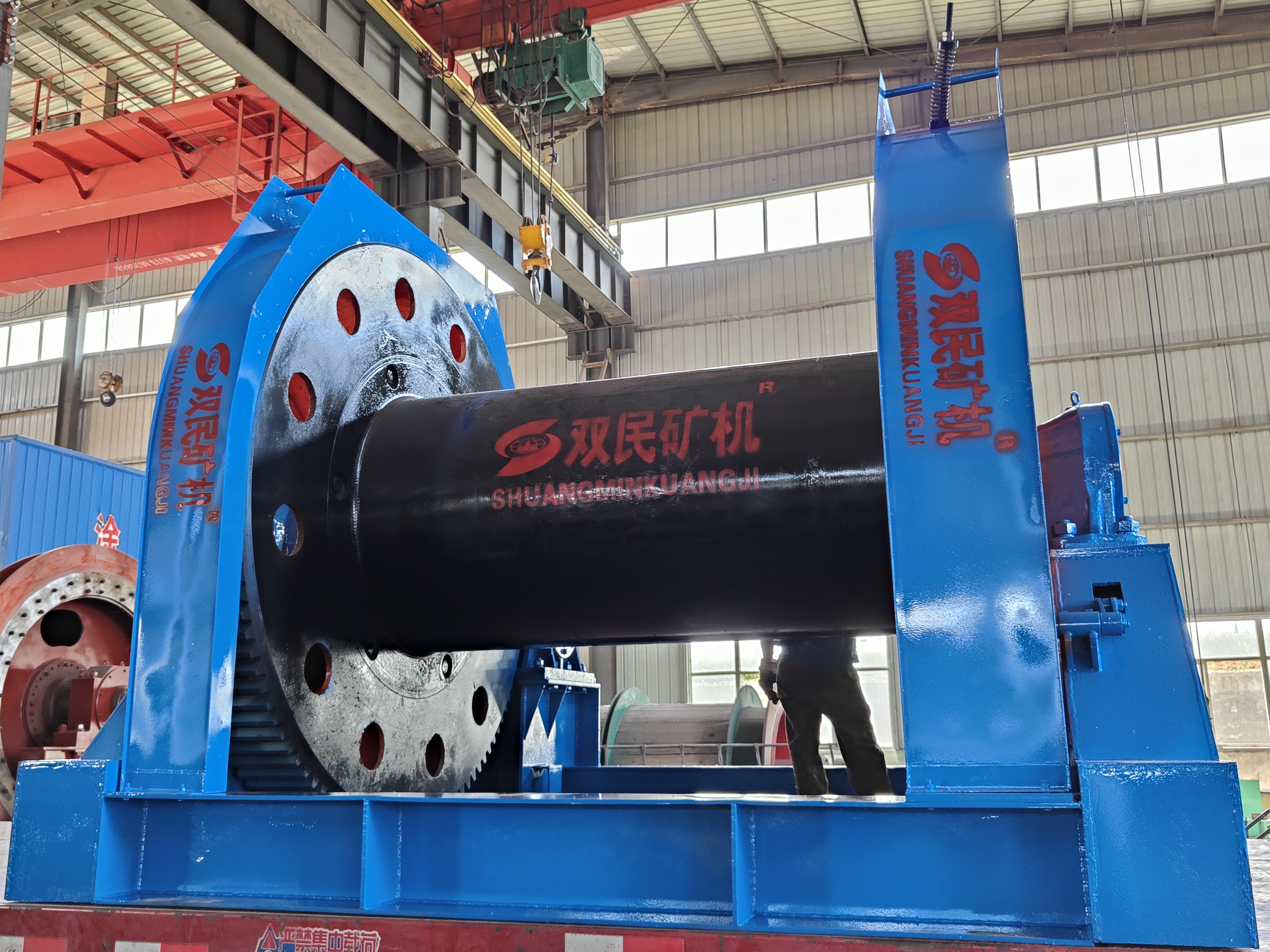 主軸裝置由卷筒、主軸、軸承、大齒輪、制動輪等零件組成,是絞車的鋼絲繩纏繞機構(gòu)。卷筒與齒輪、制動輪用緊配鋼套河和螺拴聯(lián)成一體;鋼絲繩通過制動輪上的孔用壓板固定在制動輪的輪輻上;鋼絲繩在卷筒上方出繩。