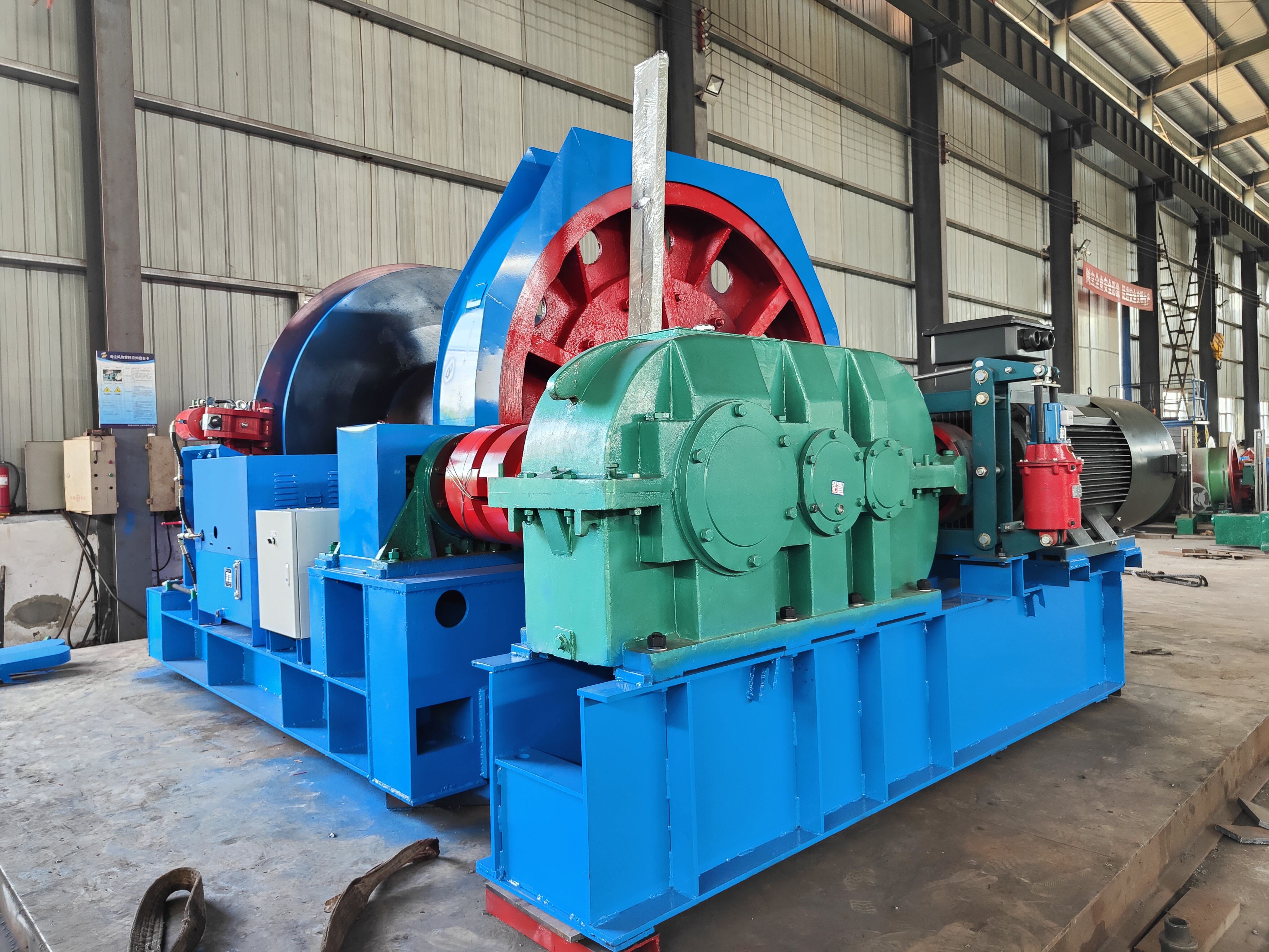 本絞車主要用于煤礦、金屬礦和非金屬礦豎井井筒掘進(jìn)時(shí)懸吊吊盤、水泵、水管、注漿泵、風(fēng)筒等掘進(jìn)設(shè)備和張緊穩(wěn)繩,該絞車系雙鋼絲繩懸吊。將減速機(jī)上的差動(dòng)手把放在差動(dòng)位置,若張緊穩(wěn)繩,可使兩根穩(wěn)繩的張緊力保持相等;若懸吊水管、注漿管、風(fēng)筒等管類設(shè)備,可保證其被懸吊管類設(shè)備與地面保持垂直的狀態(tài)。如果懸吊吊盤等盤狀設(shè)備,需將其差動(dòng)手把放在直通位置,才能實(shí)現(xiàn)兩繩繩速的一致。