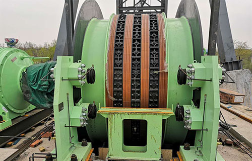JKMD型多繩摩擦式提升機(jī)采用低速電動(dòng)機(jī)時(shí)可不用減速器,電動(dòng)機(jī)直接與卷筒主軸相連,或?qū)㈦妱?dòng)機(jī)轉(zhuǎn)子裝在卷筒主軸的末端。傳動(dòng)功率大時(shí),可采用2臺(tái)或4臺(tái)電動(dòng)機(jī)同時(shí)驅(qū)動(dòng)。一臺(tái)提升機(jī)的總功率已達(dá)到11600千瓦。制動(dòng)系統(tǒng)是保證提升機(jī)安全運(yùn)行的重要裝置。遇緊急情況時(shí),制動(dòng)系統(tǒng)應(yīng)通過可調(diào)節(jié)制動(dòng)力矩的液壓系統(tǒng)產(chǎn)生兩級(jí)安全制動(dòng),以保證提升機(jī)及時(shí)停車又不生產(chǎn)制動(dòng)過猛現(xiàn)象。交流電動(dòng)機(jī)驅(qū)動(dòng)的提升機(jī)。其制動(dòng)系統(tǒng)還要具有靈敏的制動(dòng)力矩可能性能,以準(zhǔn)確控制提升機(jī)在臨近通車點(diǎn)時(shí)的運(yùn)行速度。