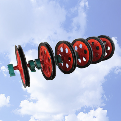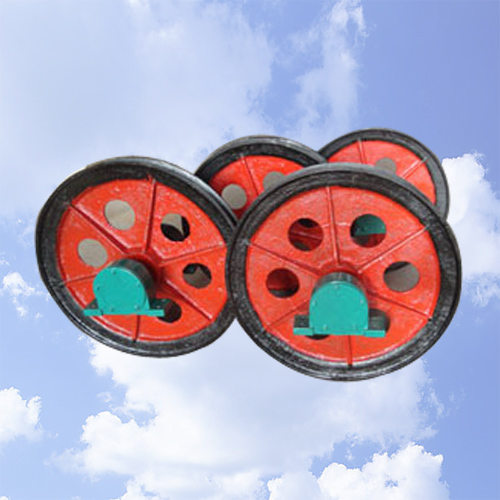 礦用天輪安裝在井架上,作支撐,供礦井提升時支拖提升機卷筒到提升容器之間,引導鋼絲繩轉向之用。繩槽帶塑襯或膠塊,增加鋼絲繩的使用壽命。