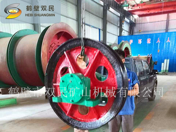 1、雙槽懸吊天輪和單槽懸吊天輪的結(jié)構(gòu)主要有繩輪、固定軸、及軸承座組成。繩輪內(nèi)孔鑲嵌有合金銅套,工作時繞軸作旋轉(zhuǎn)運動,輪轂上裝有油杯,供軸與銅套之間潤滑用。雙槽天輪有兩個繩輪,其間裝有調(diào)整圈,可以對兩輪之間的距離進(jìn)行調(diào)整。