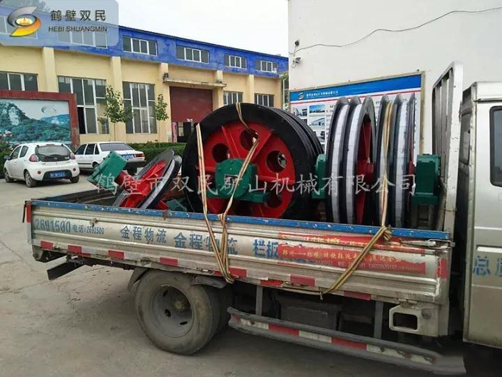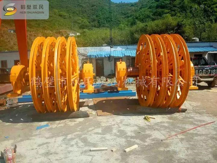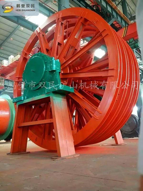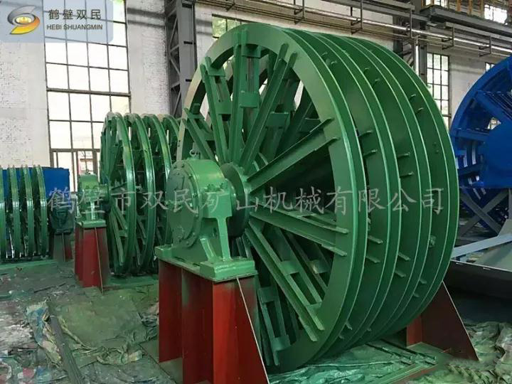 天輪由軸、天輪、滾動軸承、軸承座等組成, 一個天輪固定在軸上,稱為固定天輪,其余天輪其輪轂內(nèi)嵌一個銅套,活裝在軸上,對軸可作相對轉(zhuǎn)動,以消除因各條提升鋼絲繩的速度差對天輪的滑動摩擦。
